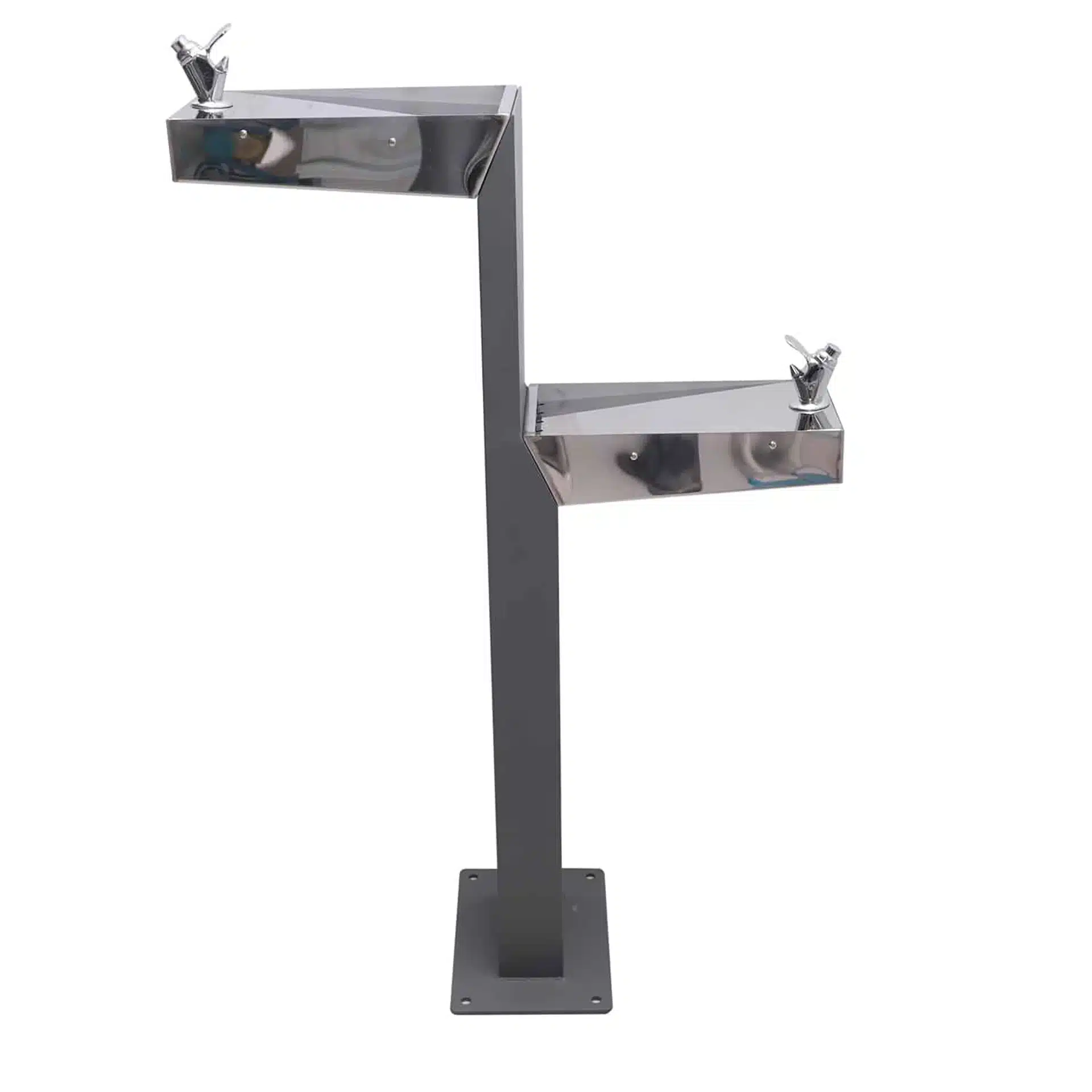La fuente adaptada, tiene un diseño urbano contemporaneo. Compuesta por una columna vertical, en acero inoxidable y pintura polvo al horno, tratada para resistir la corrosion y el desgaste ambiental. Consta de dos grifos pulsador, uno en su parte superior y otro a una altura adaptada, para personas con movilidad reducida en silla de ruedas. Su base se encuentra una rejilla de acero galvanizado, que actua como sumidero. Su estetica permite integrarla en entornos urbanos modernos o tradicionales.